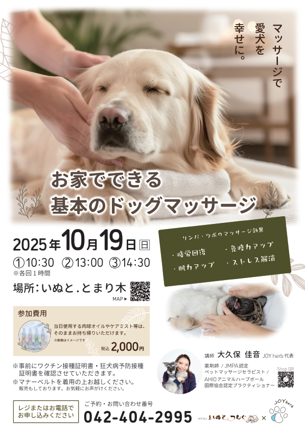 講師は薬剤師資格も有する専門家が務め、リンパやツボを意識したマッサージ方法を学びながら、免疫力の向上やストレス軽減、血行促進など、愛犬の健康維持に役立つ知識を実践的に体験いただけます。